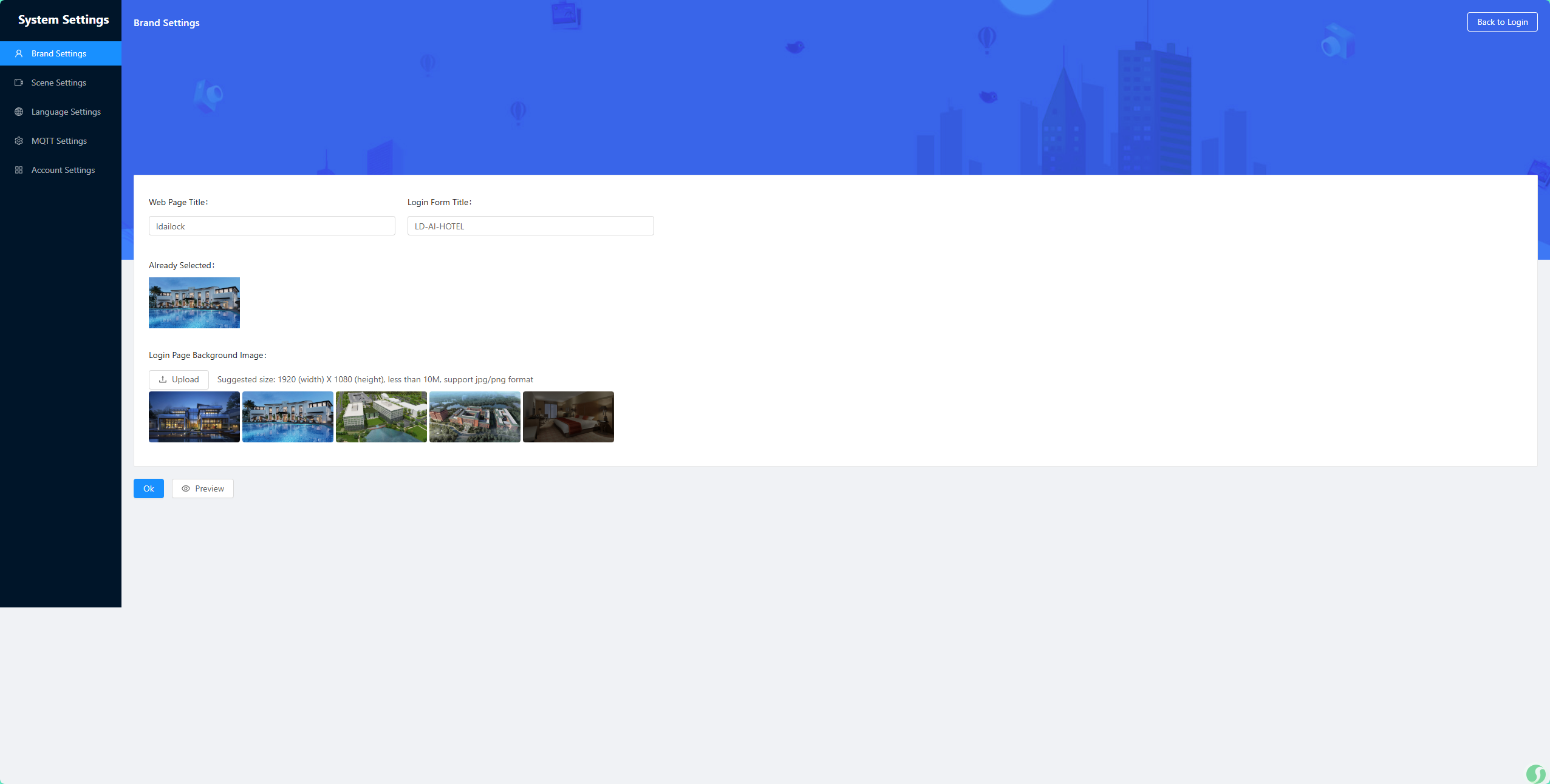 The built-in management platform login interface supports hotel brand display, allowing users to independently change the main title and background image to fully showcase the hotel’s image